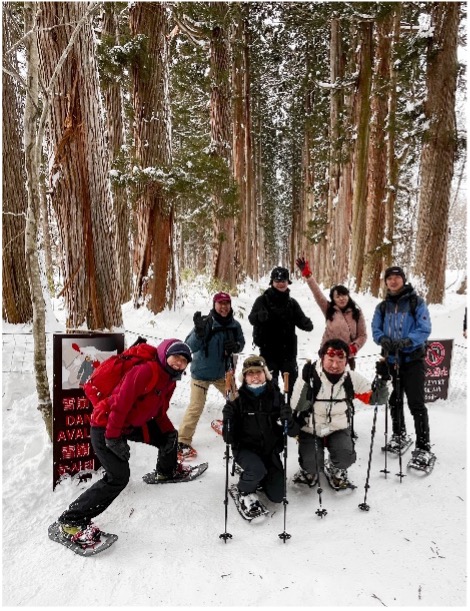 試験では、スノーシューの安全配慮や時間管理、ローカルガイドとの連携などを重視。英語ガイディングでは通訳も行うなど実践的で濃密な内容でした。受講者の皆様は日頃からガイドとして活躍されている方、これからガイドとして活躍したい方と様々で、それぞれのスキルを活かしたガイディングで、私たちも日常業務に生かせる学びが多く、大変有意義な時間となりました。戸隠でガイドをされている吉本さん、岡部さん、上原さんにもご協力いただき、地域に根ざした学びを深める機会ともなりました。